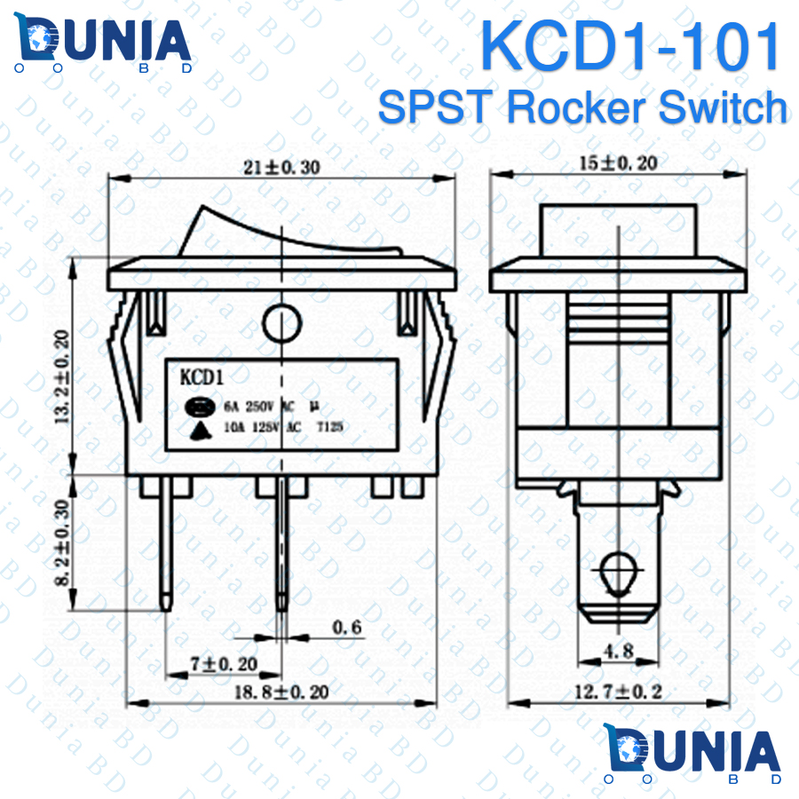 KCD1-101 SPST Rocker Switch 6A 250V AC ON-OFF