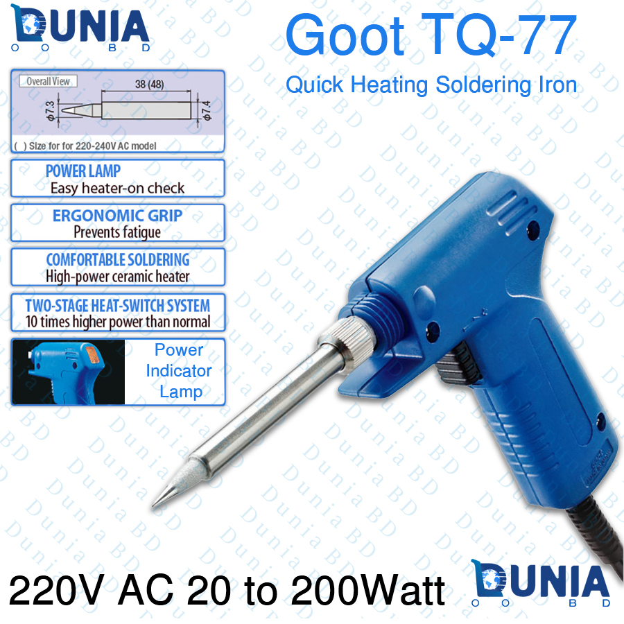 - The TQ-77 is a quick-heat soldering iron engineered by goot / Taiyo Electric to deliver rapid thermal performance for both heavy and delicate soldering tasks. Its two-stage heat switch system allows the iron to operate at high power when needed, and drops to low standby power when idle — saving both energy and tip life.