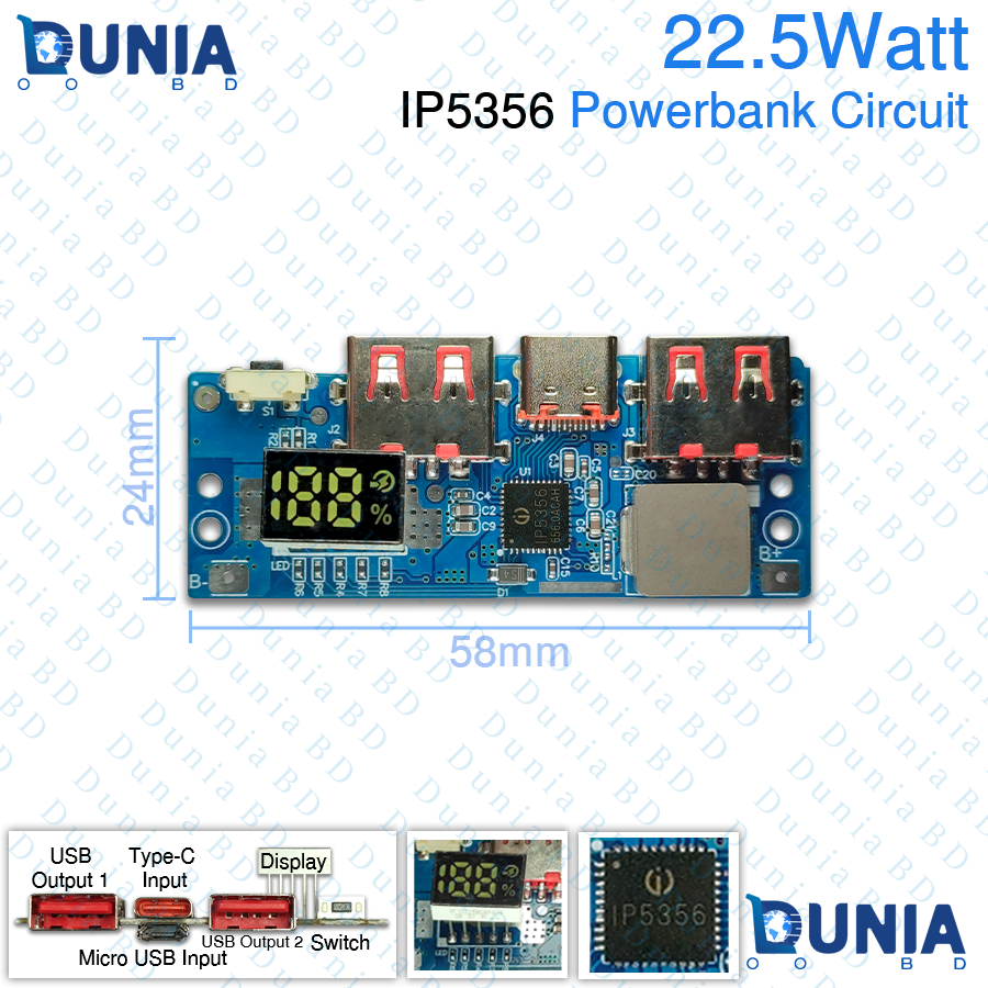 - The IP5356 22.5W Powerbank Circuit Board from Dunia BD is a high-performance module designed for DIY enthusiasts and electronics builders in Bangladesh. Featuring the advanced IP5356 chip, this compact board supports up to 22.5W fast charging with PD (Power Delivery) and QC (Quick Charge) protocols, making it perfect for modern smartphones, tablets, and other USB-powered devices.