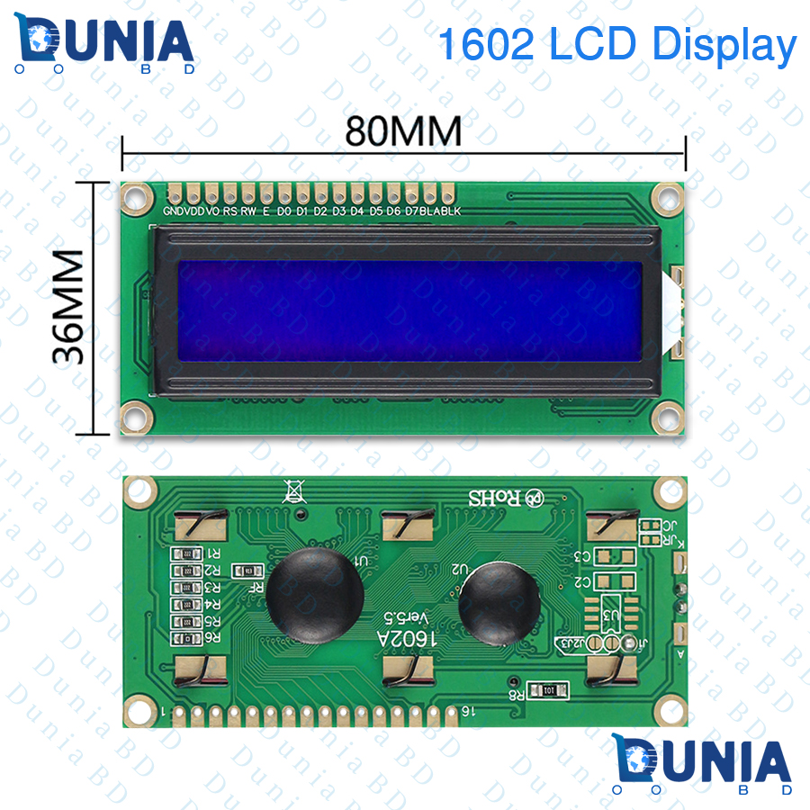 - Why makers across Bangladesh love this LCD 1602 I2C module blue: ✔ Plug-and-play with LiquidCrystal_I2C library – 30-second “Hello World” ✔ Saves 5 GPIO pins vs parallel LCD ✔ 5V logic & backlight, 80mA total – runs on any USB power bank ✔ Pre-soldered header pins + bonus 4-pin cable in every pack ✔ 87×32×13mm – fits inside robot chassis or 3D-printed case